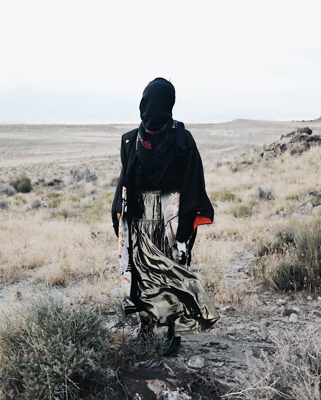Several of my relatives were born in the Japanese Internment camp Topaz during WWII. A couple of years ago, I visited the Topaz Museum in Delta, UT, with my family. Chiura Obata, a Japanese artist from Berkeley, founded an art school in the camp that grew to accommodate 600 students. Obata started this art school initially for his desire to continue painting. However, it soon proved that it was also an opportunity for those distressed by internment to immerse themselves in the beauty of art and its creative healing power. I found inspiration from Obata and those who could find beauty and cultivate art despite being forced from their homes in California and shipped to the desolate West Utah Desert. These photographs depict the barren mountains outside of Topaz and feature my three aunts. A quote from one of the leading art instructors at the camp says, "art maintains high ideals among our people, for its object is to prevent their minds from remaining on the plains, to encourage human spirits to dwell high above the mountains." These portraits remember those spirits who linger–embellishing them with beautiful, lush fabrics that elevate their souls beyond their stark surroundings.